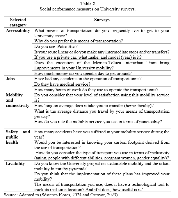 The primary objective of this study is to systematically analyse the social perceptions related to the University mobility system within the Autonomous University of the State of Mexico. This analysis focuses on five key performance measures: accessibility, employment opportunities related to mobility, overall mobility and connectivity, safety and public health, and livability. By evaluating these dimensions, the study aims to identify the strengths and weaknesses of the current mobility system from the standpoint of the University community, including students, faculty, and staff. This comprehensive assessment seeks to inform targeted improvements that can enhance the efficiency, inclusiveness, and sustainability of transportation services within the University setting.