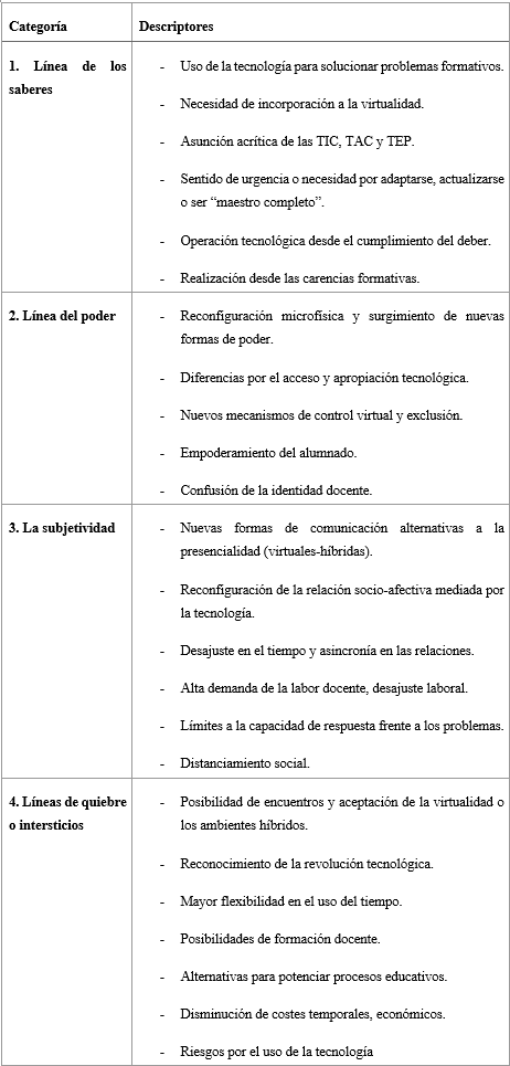 Una vez realizados todos los informes se procedió a cruzar los datos resultantes en ambos grupos de instrumentos, para articularlos con los planteamientos teóricos y conceptuales relacionados con la emergencia sanitaria, la Cuarta Revolución Industrial (CRI) y la Era digital en la docencia, logrando una interpretación del dispositivo y sus proporciones, que se presentan a continuación.