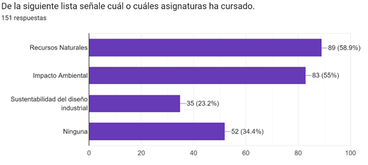 En la primera sección de datos generales, la edad fue categorizada en cuatro rangos y mostró que el 69% de los estudiantes se ubica entre los 18 y 21 años y el 27.8% representados por estudiantes entre 22 y 25 años. El 54.3% de la población son del género femenino y el 44.4% corresponde al género masculino. El semestre que cursan en este periodo considera el 27% a estudiantes de primer semestre, el 8.6% a estudiantes de tercero, el 36.4% a estudiantes de quinto, el 9.3 a estudiantes de séptimo y el 18.5% a estudiantes de noveno semestre. Se les preguntó qué asignaturas habían cursado (Recursos naturales, impacto ambiental y sustentabilidad del diseño industrial y la respuesta considera los siguientes porcentajes: el 34.4 % de los estudiantes no había cursado ninguna asignatura al respecto, el 60% ha cursado recursos naturales, el 55% impacto ambiental y 23.2% sustentabilidad del diseño industrial, (ver figura 1).