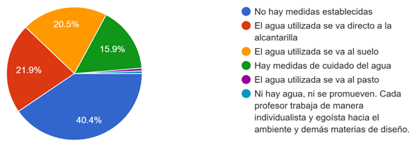 El 37.7% afirma que regularmente utiliza sustancias químicas en el proceso de diseño de algunos productos, el 31.1% los utiliza frecuentemente, el 18.5% casi nunca y el 11.3% contestó que siempre. También se les preguntó sobre las medidas de control que se establecen en los talleres de diseño para garantizar que los materiales utilizados no contaminan el agua y como se muestra en la figura 4, el 40.4% considera que no hay medidas establecidas, que el agua se va directo a la alcantarilla o al suelo. Esto nos permite percibir, que hace falta mayor difusión sobre el cuidado de los recursos y la deposición de los residuos para no alterar el ambiente.