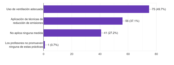 Se les preguntó ¿Qué tipo de sustancias químicas utiliza? El 91.4% respondió que pinturas, el 64.9% concluyó que resinas y el 66.9% adhesivos. La siguiente cuestión fue ¿Cómo asegura que los materiales utilizados no contaminan el aire durante el proceso de diseño? 75 estudiantes respondieron que usan ventilación adecuada o aplican alguna técnica de reducción de emisiones (ver figura 5).