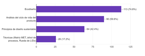 Se les cuestionó sobre ¿Qué técnicas reconoce para mitigar el impacto ambiental en el diseño de productos? Los estudiantes universitarios respondieron en un 74.8% al ecodiseño (ver figura 6 como una herramienta que busca integrar la sostenibilidad en el proceso de diseño, abordando los desafíos ambientales mediante estrategias y metodologías que minimizan el impacto ecológico de los productos como lo sugiere García (2008).
