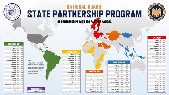 Este Instrumento vincula a las fuerzas armadas y de seguridad de casi la mitad de las naciones del mundo para promover “la paz” y “la seguridad”. Según el (DOD, 2024) , en 1993 sólo eran 13 asociaciones, y para agosto de 2024, el programa creció hasta 93 asociaciones y 106 naciones participantes. Este programa tiene como objetivo: apoyar los comandos de combate, las embajadas de los EE. UU. y los objetivos de las naciones amigas; desarrollar la capacidad de defensa; aumentar la preparación de las fuerzas de EE. UU y sus socios, para enfrentar los desafíos emergentes y fomentar las relaciones personales e instituciones duraderas. De acuerdo con DOD, el programa pretende intercambios; visitas de familiarización; entrenamiento y ejercicios cooperativos; respuesta a desastres y emergencias; desarrollo de oficiales y suboficiales; ciberdefensa; tácticas de infantería y contraterrorismo. (DOD, 2024)
