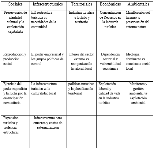 A través de las 17 contradicciones externas fue posible identificar las Contradicciones de la Industria turística en Cozumel, las cuales refieren a las tensiones y conflictos que surgen en el contexto de la planificación, desarrollo y gestión del turismo. Estas contradicciones pueden manifestarse en diversas dimensiones, incluyendo lo económico, social, ambiental y territorial.