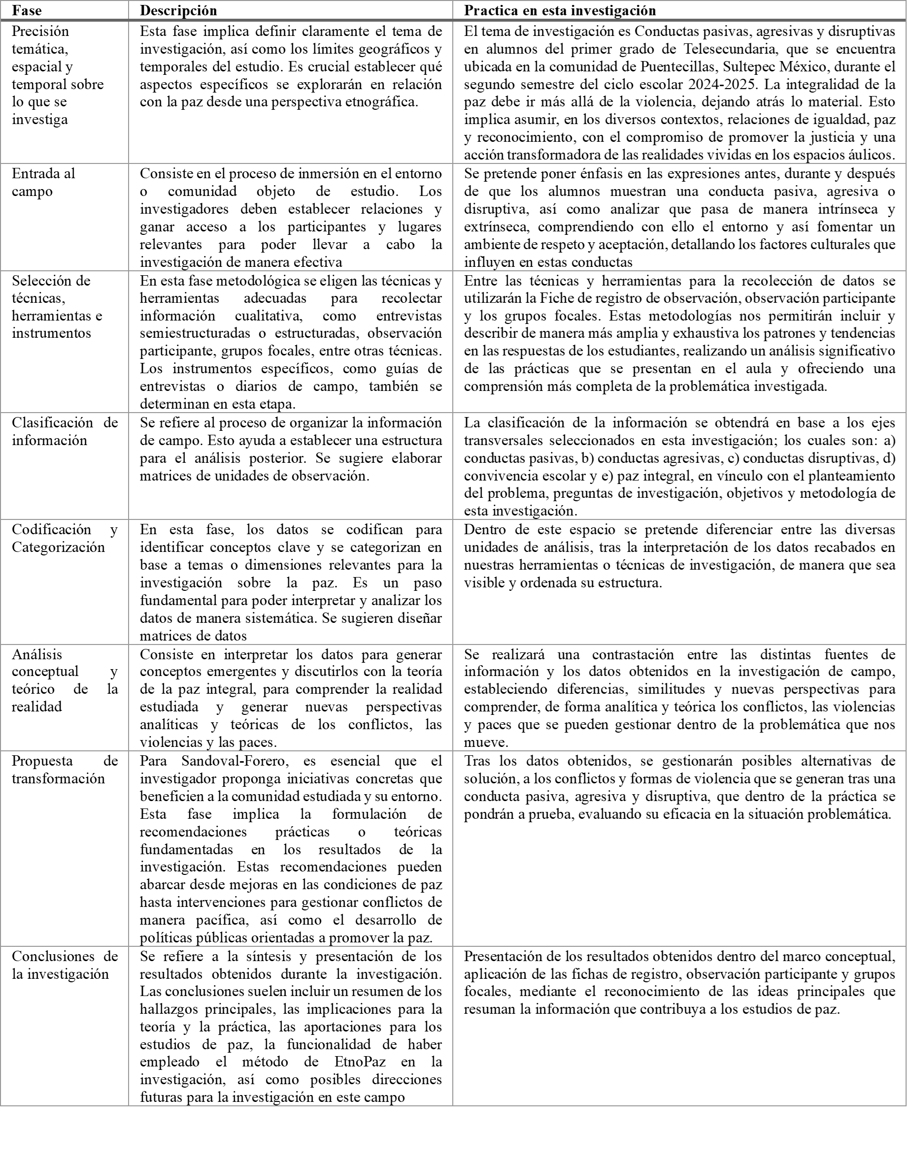 En la siguiente tabla se retoma la descripción de las fases de la EtnoPaz de Mastache-Salazar, indicando como se pondrán en práctica en el presente proyecto de investigación: