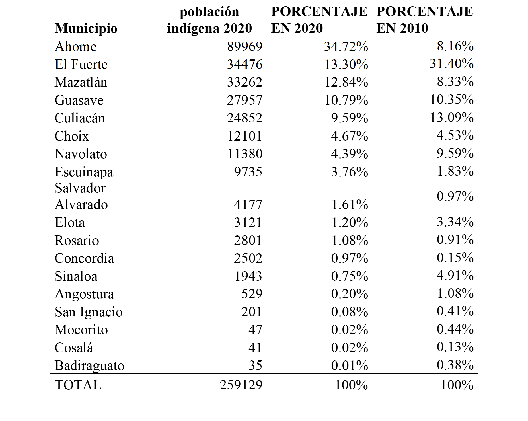 Los yoremes se encuentran en continuo contacto con los no indígenas “yoris” donde viven cotidianamente los procesos interculturales. Los municipios de mayor población indígena actualmente en Sinaloa son (INPI, 2020): Ahome con un 34.72%, El Fuerte, que representa el 13,3% del total, Mazatlán con un 12,8%, Guasave con el 10.79% y Culiacán con un 9.59 del total, según se muestra en la tabla 1.