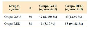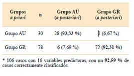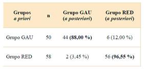 Un segundo AD fue aplicado para dos grupos a priori basados en relación al largo de la gluma con su antecio adyacente. El grupo GAU (que incluyó a Anthoxanthum gunckelii, A. altissimum y A. utriculatum), asignado para los especímenes que poseían glumas menores o iguales a sus antecios adyacentes y el grupo RED (A. redolens) para los especímenes con glumas más largas que sus antecios adyacentes. El análisis determinó un 92,59 % de casos correctamente clasificados de 106 casos con las 16 variables predictoras (Tabla 4). La selección por pasos (hacia adelante) para los grupos a priori, definió cinco variables predictoras con un 91,67% de casos correctamente clasificados (Tabla 5).