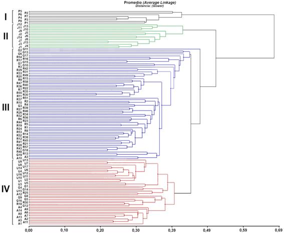 El análisis de coordenadas principales (PCoA) fueron transformadas a log los caracteres que de la MBD combinada permitió reconocer cinco no se alcanzaron dicha distribución luego de la transformación, fueron eliminados de la matriz, creando una segunda MBD para los análisis multivariados (MBD combinada). Los análisis sucesivos se realizaron en la nueva MBD que contenía 131 OTUs y 41 variables (26 variables cuantitativas y 15 cualitativas), a las cuales se les aplicó análisis de conglomerados (AC) y análisis de coordenadas principales (ACoP) (Legendre & Legendre, 1998; Legendre & Anderson, 1998). Para el AC se aplicaron los algoritmos de agrupamiento por encadenamiento promedio no ponderado (UPGMA) (Sokal & Michener, 1958) y grupos (Fig. 6) para las especies chilenas de Anthoxanthum.