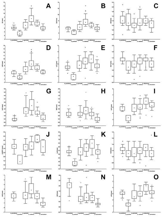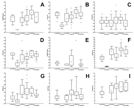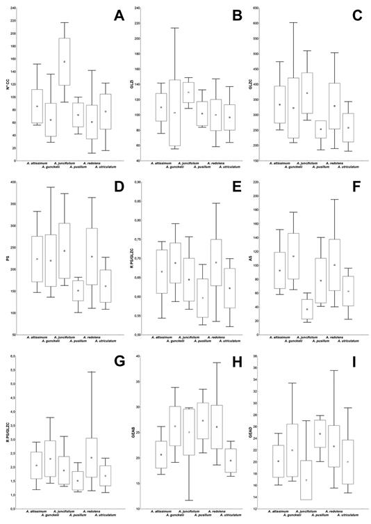 Con los datos registrados en la MBD inicial, se realizó una tabla resumen (no mostrada, disponible si se solicita) con los parámetros estadísticos obtenidos. Adicionalmente, mediante Boxplot, se grafica la variabilidad para los 74 caracteres (variables) (Figs. 2-5, 8-9), información que fue utilizada para la descripción de los taxones estudiados.