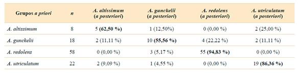 Un tercer AD fue aplicado a grupos a priori basados en la presencia de esclerénquima continuo subepidérmico abaxial, la relación de la gluma con su antecio adyacente y la forma de la espiguilla, que posee dos estados, U o V. De esta manera, se crearon cuatro grupos a priori: 1) especímenes que poseían esclerénquima continuo bajo la epidermis abaxial, glumas más cortas que sus antecios y espiguillas en forma de V, asignados como A. altissimum; 2) especímenes con esclerénquima continuo, glumas más cortas que sus antecios y espiguillas en forma de U, fueron asignados como A. utriculatum; 3) especímenes con ausencia de la capa de esclerénquima continuo subepidérmico, glumas más cortas en relación a su antecio y espiguillas en forma de V, asignados como A. gunckelii y 4) especímenes que no presentaban capa continua de esclerénquima abaxial, glumas más largas que sus antecios adyacentes y espiguillas en forma de V, fueron asignados a A. redolens.