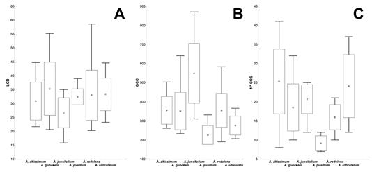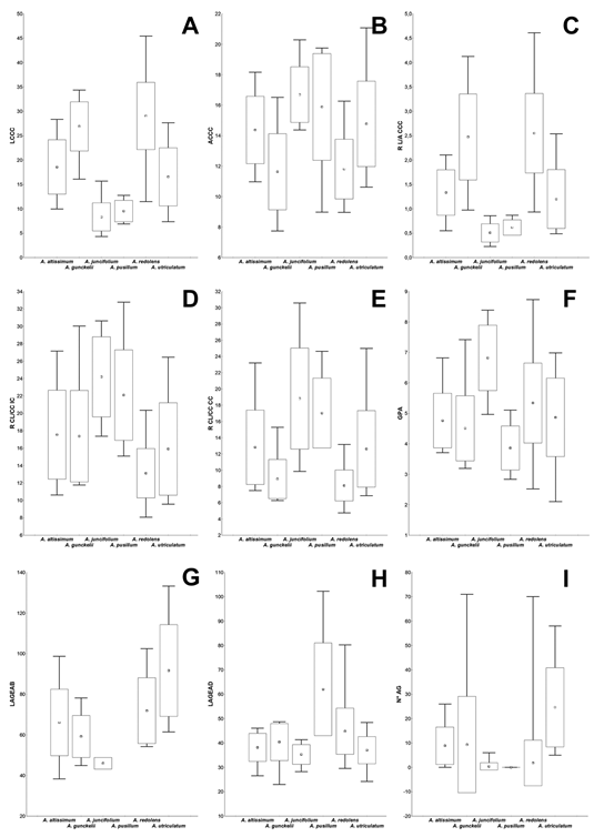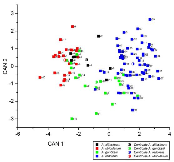 El grupo A. redolens se representó en el primer eje canónico, dispersándose a lo largo del segundo eje, su centroide ubicado en el extremo positivo del primer eje canónico, diferenciado del resto de los grupos. El grupo A. gunckelii no se diferenció en ninguno de los ejes canónicos, su centroide ocupó una posición intermedia entre A. redolens y A. utriculatum a lo largo del eje canónico 1. El grupo A. utriculatum, se agrupó en el extremo negativo del primer eje canónico mientras que A. altissimum, se agrupó cercanamente a A. utriculatum, evidenciado por la cercana posición entre los centroides (Fig.