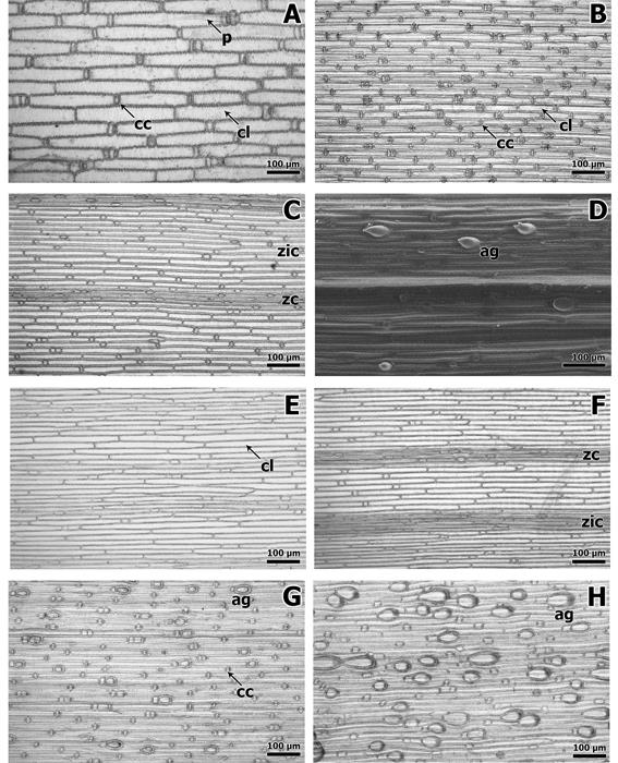 Para observar las epidermis abaxiales, fue removida la epidermis adaxial y células parenquimáticas con ayuda de un escalpelo, posteriormente las epidermis abaxiales fueron decoloradas con solución de hipoclorito de sodio al 10%, hasta quedar traslúcidas, y luego fijadas con una gota de glicerina de Kisser en portaobjeto (Metcalfe, 1960). Tanto las muestras del corte transversal como las de la epidermis abaxial fueron observadas y fotografiadas con una cámara Zeiss Axiocam ERc5s acoplada a un microscopio óptico (MO) Zeiss Axiostar a 5x y 10x, las muestras fueron medidas con ayuda del software Zen ver. 2.0 y los valores registrados en una planilla de cálculo Excel®. Las epidermis adaxiales luego de ser restituidas, fueron secadas y observadas mediante microscopio electrónico de barrido (MEB) marca Hitachi SU3500 ubicado en el laboratorio de Microscopía electrónica, del Departamento de Ciencias Básicas de la Universidad del Bío-Bío, Sede Chillán. Para la descripción de los caracteres anatómicos, se utilizó la terminología descriptiva de Ellis (1976, 1979).