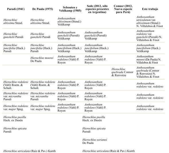 Trabajos recientes realizados por Lema-Suárez (2017) y Lema-Suárez et al. (2018) aceptan sólo tres de las siete especies nativas del continente bajo Hierochloe: H. quebrada, H. redolens (Vahl) Roem. & Schult. (=A. redolens [Vahl] P. Royen), H. pusilla Hack. ex Dusén (=A. pusillum [Hack. ex Dusén] Veldkamp) y H. juncifolia (Hack.) Parodi (=A. juncifolium [Hack.] Veldkamp), en tanto, subordinan a H. altissima Steud. (= A. altissimum [Steud.] Veldkamp), H. gunckelii Parodi (=A. gunckelii [Parodi] Veldkamp), H. spicata Parodi (=A. spicatum [Parodi] Veldkamp) y H. utriculata Ruiz & Pav. (=A. utriculatum [Ruiz