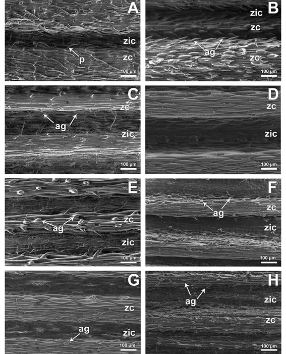 Epidermis abaxial con zonas costales e intercostales diferenciables o poco diferenciables; células largas intercostales de forma rectangular o levemente hexagonal, paredes anticlinales con o sin perforaciones visibles; células cortas intercostales suberosas o silíceas, cuadradas, rectangulares o levemente enangostadas en el centro, distribuidas de manera alternada con las células largas, solitarias o en pares; estomas ausentes o escasamente presentes, limitados principalmente a la epidermis adaxial; aguijones ausentes, o presentes, de base redondeada u ovalada, barbas de la mitad, igual o el doble de largo, en relación a su base; macropelos presentes o ausentes; papilas ausentes. Epidermis adaxial con aguijones en forma de gancho, con base bulbosa presentes desde tercio superior de la costilla hasta al ápice de la misma, macropelos ausentes o presentes, limitados principalmente a la zona del ápice de las costillas. Figs. 12 y 13.