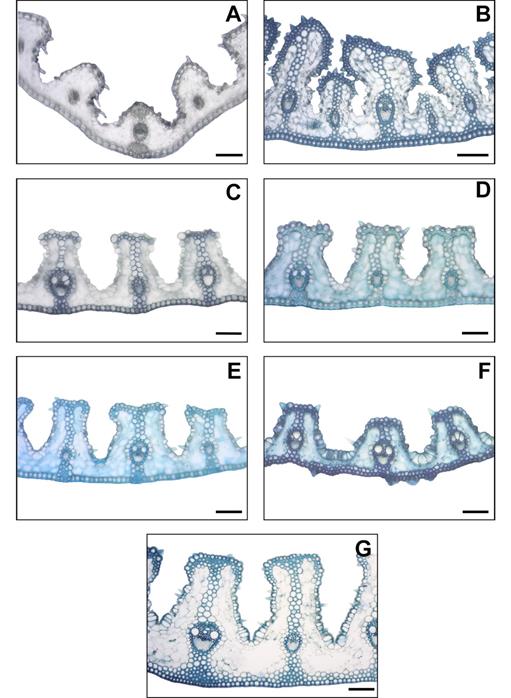 Anatomía de la lámina en sección transversal Sección transversal de contorno plano; semiláminas de igual longitud a ambos lados de la cos- tilla central, de 10 a 32 costillas por lámina; de grosor similar a lo largo de la lámina, de 327,7± 79,6 (189,9-602,1) µm de alto, asociadas a los haces vasculares; surcos intercostales abiertos, presentes en la cara adaxial, en forma de U, de 103,1 ± 36,2 (40,3-195,0) µm de ancho a la altura del haz vascular, profundidad de más de la mitad del grosor de la lámina, de 227,3 ± 63,3 (110,7-388,2) µm desde el ápice de la costilla; costilla central aproximadamente igual en grosor al resto de las costillas, de 353,8 ± 89,8 (190,2-639,9) µm de alto; haces vasculares trabados a la epidermis adaxial por células parenquimáticas engrosadas y trabados a la epidermis abaxial por células parenquimáticas engrosadas y/o esclerenquimáticas. Células esclerenquimáticas agrupadas de forma triangular o trapezoidal traban el haz vascular a la epidermis abaxial, en la epidermis adaxial, presente en el ápice de la costilla, siguiendo su forma, bajo la epidermis adaxial; estomas presentes en la epidermis adaxial, en el surco de la costilla, próximos a la altura del haz vascular.