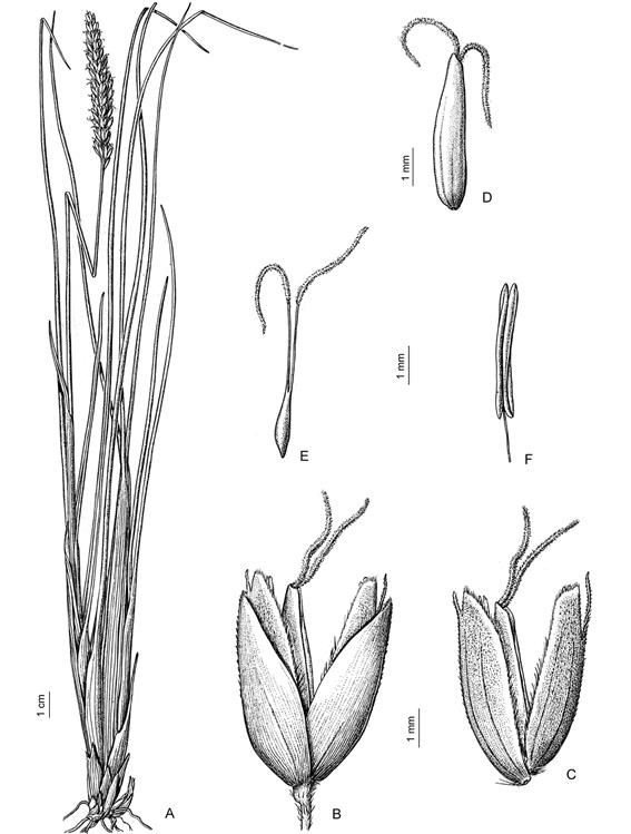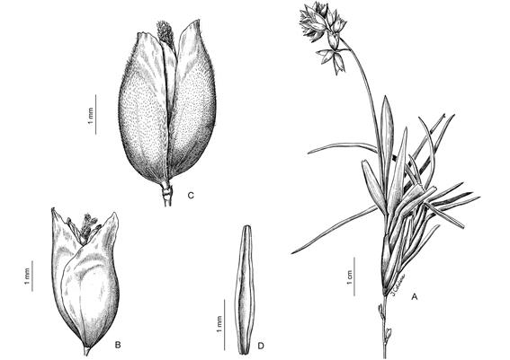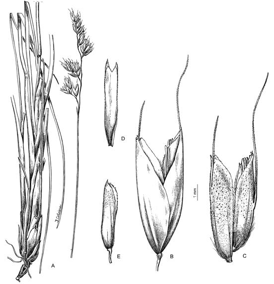 Anthoxanthum quebrada (Connor & Renvoize) N. Villalobos & Finot, comb. nov. Hierochloe quebrada Connor & Renvoize, Kew Bull. 64(4): 728-732. 2009. TIPO: Perú: Ancash, 37 km E of Yungay, 5-IV-1988, S. A. Renvoize & S. Laegaard 5079 (holotipo K; isotipos AAU, MO-4945250 imagen!). Fig. 11D.