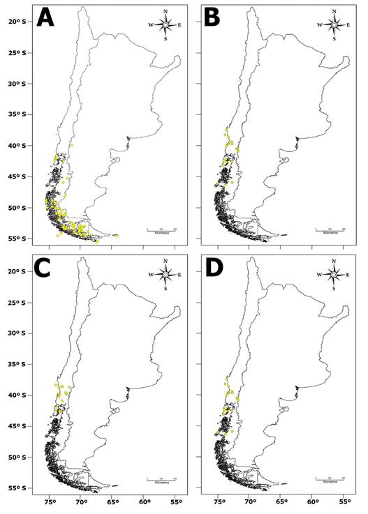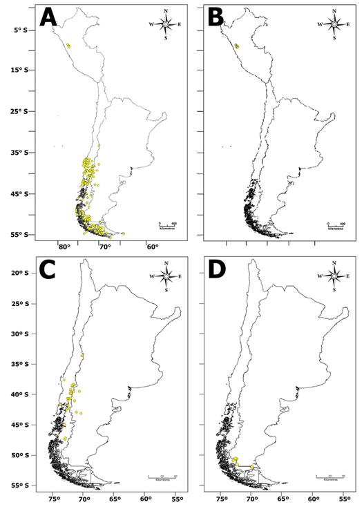 CHILE. Región de la Araucanía. Prov. Cautín, P. N. Conguillío, 1164 m s.m., 22-II-2006, Marticorena & Jiménez 537 (CONC). Prov. Malleco, Volcán Lonquimay faldeo sur, 1200 m s.m., 7-I-1994, Villagrán et al. 8038 (CONC). Región de Aysén del General Carlos Ibáñez del Campo. Prov. Aysén, Lago Yulton, terraza orilla oeste, 495 m s.m., 22-I-2007, García 4007 (CONC). Prov. Capitán Prat, Rio Ñadis, 90 m s.m., 23-I-2007, Jiménez 195 (CONC). Región de Los Lagos. Prov. Osorno, Volcán Casablanca, Antillanca, 13-II-1972, 1220 m s.m., Muñoz & Muñoz 491 (SGO). Prov. Llanquihue, Volcán Osorno, La Picada, 900-1500 m s.m., 28-XII-1939, Gunckel 9387 (CONC). Prov. Palena, VolcánHornopirén, Carretera Austral, 500 m s.m., 01-III-