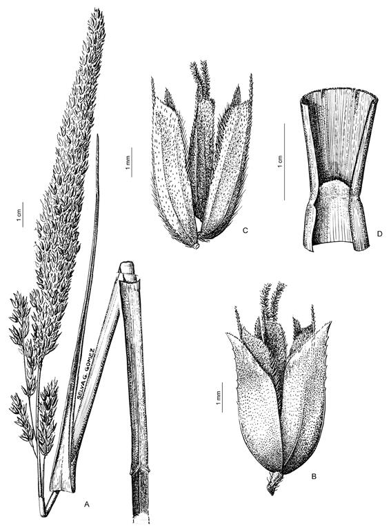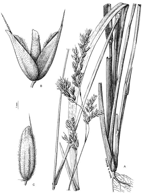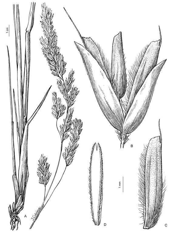 Plantas perennes, robustas, de 90,7 ± 26,1 (45,0-146,5) cm de altura, con largos rizomas, con inflorescencias que emergen totalmente de entre las hojas; láminas foliares subconvolutas o planas en material seco, pubescentes en el margen, escabrosas por la cara abaxial, hasta 50 cm x 0,5 a 0,9 cm; lígula membranácea, dentada, de 2,3 ± 1,0 (1,1-4,5) mm de largo; panícula densa, espiciforme, a veces interrumpida en la base, de 15,3 ± 2,7 (9,5-22,0) x 1,6 ± 0,3 (1,2-2,3) cm; espiguillas en forma de U, de 6,1 ± 0,6 (4,9-7,3) mm, glumas inferiores generalmente menores que la glumas superiores, excepcionalmente iguales o mayores; glumas inferiores de 6,6 ± 1,5 (3,5-12,9) x 1,3 ±0,2 (0,8-2,1) mm, menores, iguales o mayores que su antecio; glumas superiores de 7,4 ± 1,7 (3,9-