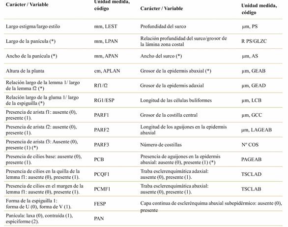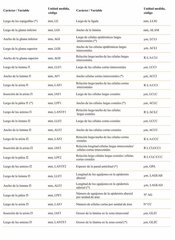 Se definieron 76 caracteres, de los cuales 42 corresponden a caracteres morfológicos y 34 a caracteres anatómicos (Apéndice I), cuidando de incluir los caracteres considerados con valor discriminante en trabajos taxonómicos previos (Parodi, 1941; De Paula, 1975; Sede, 2012). Los caracteres se midieron utilizando una lupa estereoscópica Zeiss Axiostar equipada con una cámara digital Axiocam ERc5s; las mediciones se realizaron con ayuda del software Zen ver. 2.0 y se registraron en una planilla de cálculo Excel®.