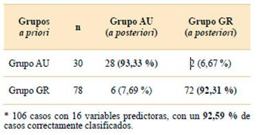 El AD fue aplicado a la matriz con dos grupos designados a priori, basados en la presencia o ausencia de esclerénquima subepidérmico abaxial: El grupo AU que incluyó a Anthoxanthum altissimum y A. utriculatum, caracterizado por la presencia de una capa de esclerénquima continua bajo la epidermis abaxial y el grupo RG que incluye a A. redolens y A. gunckelii, que no poseen la capa esclerenquimática continua bajo la epidermis abaxial. El análisis determinó un 92,59% del total de los casos correctamente clasificados, utilizando las 16 variables predictoras (Tabla 2). La selección por pasos determinó 6 variables (Tabla 3), con un 91,67% de casos correctamente clasificados.