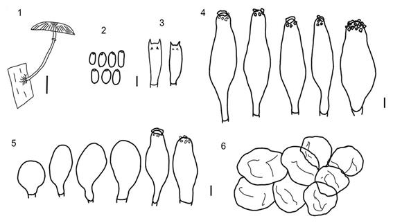 Here we consider the species described from Cuba as Agaricus euthugrammus Berk. & M.A. Curtis the same entity. It possesses smaller pileus reaching 8 mm in diam. and a filiform stipe that is distinctly strigose at base (Berkeley & Curtis, 1868). Microscopically, Kits van Waveren (1995) found shorter basidiospores 4.5-5 × 3-3.5 µm without germ pore and several thin-walled pleurocystidia and mentioned that Smith’s (1972) basidiospores drawings were probably erroneously depicted. Dennis (1961) also did not refer to germ pore in the Venezuelan material of P. euthygramma, but he frequently did not cite this feature for almost any species cited by him. Actually, we strongly conclude that our specimens belong to P. euthygramma. Although Kits van Waveren (1995) reported the absence of germ pore in the basidiospores of the holotype, is important to mention that the type specimens were described with much smaller pileus diameter (8 mm). Probably the lack of germ pore is due age of the basidiomata, on which only in more mature ones, as occur in Brazilian collection, the germ pore is evident. We consider our collection as mature basing in the size of the basidiomata.