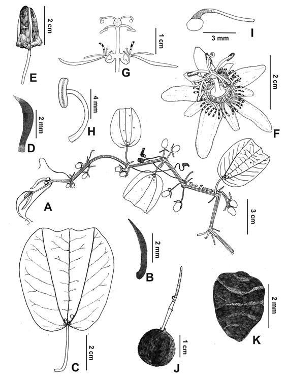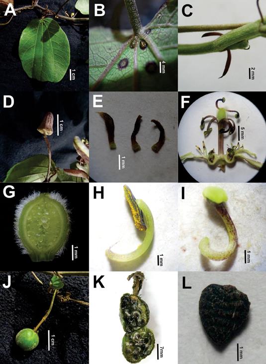 Herbaceous vine, 2-4 m, pubescent with curved trichomes 0.1-0.3 mm, stem striate, stipules 3-5 × 0.4-0.6 mm, linear, falcate. Petiole glandless, 1-4 cm. Lamina 2-3 lobed, 3-7.5 × 2-6 cm, 2-11 conspicuous laminar nectaries. Peduncles 1-4 cm, in pairs or solitary. Bracts linear-lanceolate, scattered, 2-4 × 0.4-0.6 mm. Flowers 4-4.3 cm in diameter. Sepals oblong-lanceolate 1.7-2 × 0.6-0.8 cm, reddish to greenish abaxially, white adaxially. Petals oblong- lanceolate 0.7-1 × 0.2-0.3 cm, white. Corona in 2 series, outer series up to 5 mm, liguliform, curved at apex, sometimes dilated, white with 2-3 purple bands, inner series 3-4 mm, white to greenish, flattened 1-2(3) clavate at apex. Androgynophore 10 mm. Ovary 2-3 × 2.5-3.5 mm, globose, pubescent, greenish. Globose berry 1-1.5 × 1-1.5 cm, pubescent, green when unripe, black when ripe; seeds obovoid, black, transversely 4-5 surcate, 3-3.3 × 2-2.5 mm.