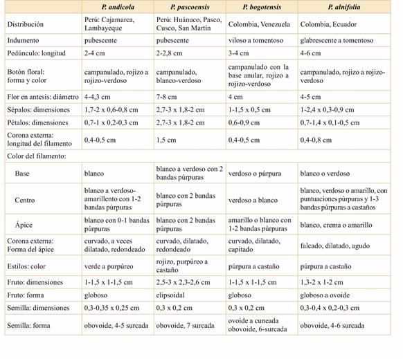 Las semejanzas y diferencias antes mencionadas, entre P. andicola, P. alnifolia, P. pascoensis y P. bogotensis se detallan en la Tabla 1; las flores de cada una de estas especies se ilustran en la Figura 5.