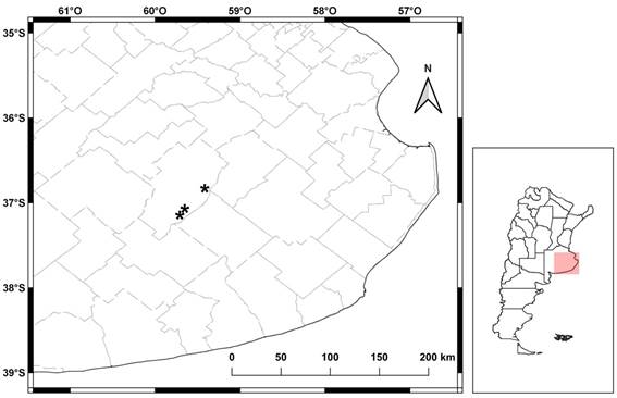 ARGENTINA. Buenos Aires. Pdo. Azul, Sierras de Azul, Sistema de Tandilia, en cerro San Pablo, 37°03’27”S 59°40’26”O, 7-VIII-1999, D´Alfonso & Farina s.n. (FAA 3535); Ruta 80, 37º07’46,47”S 59º41’48,52”O, 28-IV-2019 (fl, fr), Bardi s.n. (FAA 9899); Ruta 60, 36º 49’ 48,16’’ S 59º 28’ 03,34’’ O, 10-IV-2019 (fl, fr), Bardi s.n. (FAA 9790).