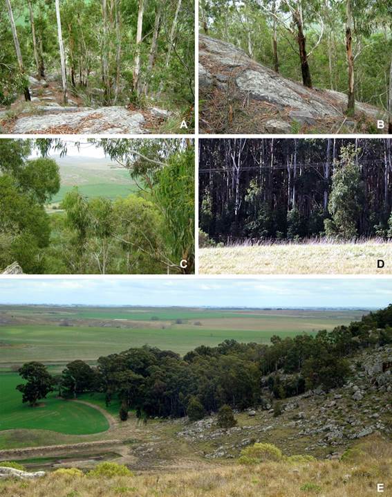 Los ejemplares hallados en las Sierras de Azul, Sistema de Tandilia corresponden a la subespecie viminalis, que presenta inflorescencias simples, trifloras y corteza lisa caediza; en Australia se ubica en varios ambientes húmedos, entre ellos en valles montañosos y sierras (Chippendale, 1988). Aunque ocupa suelos con relativa profundidad, se adapta a suelos pedregosos (Brussa, 1994). En Tandilia crece en roquedales (Figs. 3A, B, C); asimismo, se ha observado la presencia de árboles jóvenes a distancias cercanas a plantaciones en zonas de llanura (Fig. 3D) y en el piedemonte, donde algunos ejemplares presentan algunas inflorescencias con mayor número de flores. La población de E. viminalis ubicada sobre el Cerro San Pablo (Fig. 3E) permitiría categorizar a la especie como naturalizada en el país (Pyšek et al., 2004). El área de esta población se ha ido incrementando, alejándose de la plantación inicial, desde hace más de 30 años (Fig. 4).