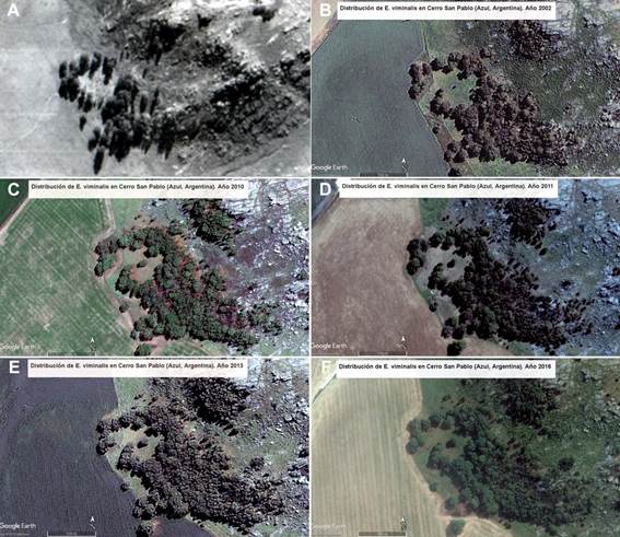 A través de fotografías e imágenes satelitales se analizó el avance del área invadida en el Cerro San Pablo, en las Sierras de Azul, Sistema de Tandilia (Fig. 4). A partir de algunos ejemplares cultivados en la base del cerro se originó una población espontánea constituida por repoblados de diferentes edades (población disetánea). Algunos ejemplares se disponen en forma agrupada y otros aisladamente. La población se ha ido incrementando a través de los años favorecida, probablemente, por episodios de incendio. Algunos ejemplares se encuentran cerca de las plantas madres pero otros han ido ocupando el pedregal y el roquedal (Fig. 3), en competencia con la flora nativa petrofítica, donde su reconocida actividad alelopática a través de la liberación de toxinas hidrosolubles, no permite el desarrollo de ningún tipo de flora herbácea e incluso plántulas del mismo género (Granados-Sánchez et al., 2007).