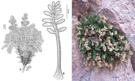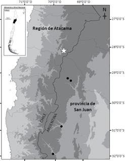 Distribución y ecología. La especie fue descrita a partir de material coleccionado por R. A. Pérez Moreau en la cordillera del Colangüil, provincia de San Juan y hasta ahora se consideró como endémica de Argentina y de dicha provincia. En la provincia de San Juan, la especie crece en la vegetación puneña entre los 2200 y 3900 m s.m. (Zuloaga et al., 2008; 2019; Weberling, 2017; Kutschker, 2019). Además, Weberling (2017) cita a la especie para la provincia de Mendoza, en la localidad de Las Heras, sin embargo, no constan colecciones en esa provincia. Los ejemplares chilenos de la especie se encontraron en una quebrada, a unos 3330 m de altitud (Fig. 2). Al parecer, al menos en el área del hallazgo, sería una especie que crece sobre las paredes rocosas que mantienen mejor la humedad, característica coincidente con algunas notas escritas en ejemplares de Argentina, como por ejemplo en Pujalte 16 (SI). En el área es una especie escasa y crece en sitios de difícil acceso, lo que explica que haya pasado inadvertida hasta ahora.