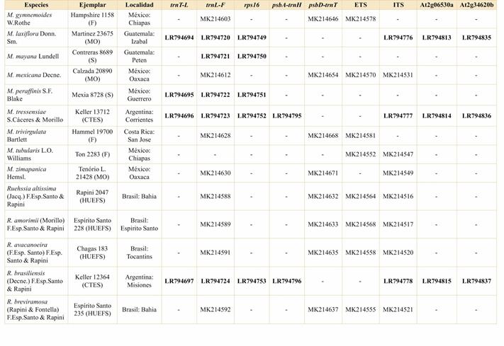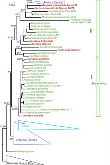 El resto de las especies se divide en dos clados, uno centroamericano con bajo soporte (BS <50%, PP = 87%), en el que se agrupan las especies caribeñas con soporte moderado (BS = 77%, PP = 92%), y otro predominantemente sudamericano (BS <50%, PP = 93%), que a su vez se divide en dos subclados. El primero de estos subclados está bien respaldado (BS = 76%, PP = 99%) y es casi exclusivamente brasileño, con R. hilariana (E. Fourn.) F. Esp. Santo & Rapini como hermana del resto de las especies. Dentro de este clado, M. castillonii Lillo ex T. Mey. se recupera como hermana de R. malmeana (W. Rothe) F. Esp. Santo & Rapini (BS = 85%, PP = 98%), formando una politomía con varios taxones brasileños. El segundo subclado sudamericano, moderadamente soportado (BS = 63%, PP = 98%), contiene a R. brasiliensis (Decne.) F. Esp. Santo & Rapini, que forma una rama muy larga debido a varios insertos únicos en el espaciador trnT-trnL y el intrón rps16, y a secuencias fuertemente desviadas para el espaciador trnH-psbA e ITS. Ruehssia brasiliensis se recupera con soporte (BS = 89%, PP = 100%) como hermana de M. cundurango Rchb. f. de Ecuador. Ruehssia altissima (Jacq.) F. Esp. Santo & Rapini se recupera como hermana de las otras especies en un subclado pequeño y bien soportado (BS = 75%, PP = 100%) de especies del sur de América del Sur, que contiene a M. tressensiae S.A. Cáceres & Morillo. Una muestra de R. rubrofusca (E. Fourn.) F. Esp. Santo & Rapini de Perú se recupera como hermana de las restantes especies en otro subclado bien respaldado (BS = 92%, PP = 100%). En este subclado, las dos muestras de la ampliamente distribuida R. macrophylla H. Karst. forman una tricotomía no resuelta con un pequeño grupo de especies centroamericanas (M. edulis Watson, M. engleriana W. Rothe y M. zimapanica Hemsl.).