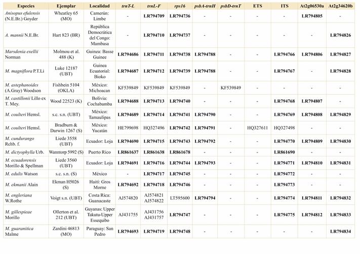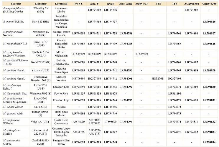 Se ensambló una matriz de 63 accesiones correspondientes a 54 especies americanas de Marsdenieae: 40 accesiones (35 taxones) de América del Sur, 13 accesiones (12 taxones) de América Central y 10 accesiones (7 taxones) del Caribe. Como grupo externo, se utilizaron cuatro especies de Marsdenieae de África Occidental: dos de Anisopus N.E. Br., M. exellii Norman y M. magniflora P.T. Li, que habían sido recuperadas como hermanas de Ruehssia en una matriz más grande (Liede-Schumann, resultados no publicados). Los ejemplares de herbario, autores de especies y números de secuencia se detallan en el Apéndice.