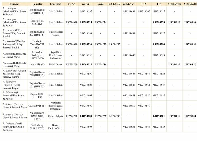 En general, el presente estudio revela una fuerte estructura geográfica en Ruehssia, a pesar del bajo soporte para algunas ramas debido a un número relativamente alto de datos faltantes. Esto es particularmente cierto para las especies mesoamericanas, que contienen las muestras con la menor cantidad de secuencias parciales disponibles. De las especies para las cuales se pudieron analizar dos accesiones, dos se recuperaron como monofiléticas (R. caatingae (Morillo) F. Esp. Santo & Rapini y R. megalantha (Goyder & Morillo) F. Esp. Santo & Rapini), una sin resolver y relacionada con especies centroamericanas (R. macrophylla). En el caso de R. rubrofusca, la colección de la Amazonía brasileña (Maas 6717) es miembro del subclado brasileño (I) del clado sudamericano, mientras que la colección de Perú (van der Werff 13992) se recupera como hermana del segundo subclado (II), señalando un concepto posiblemente defectuoso de esta especie que merece una mayor investigación.