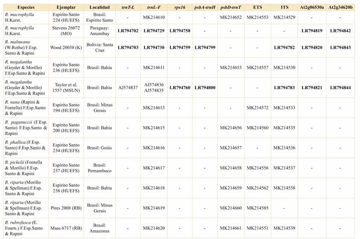 Con el fin de determinar las posiciones filogenéticas de las especies de Ruehssia argentinas, en primer lugar, se realizó la extracción de ADN total a partir de hojas frescas conservadas en sílica o de fragmentos de hojas tomadas de especímenes de herbario, utilizando el kit de extracción DNeasy Plant Mini Kit (Qiagen, Hilden, Alemania), siguiendo las instrucciones del fabricante. Se amplificaron y secuenciaron cinco marcadores cloroplásticos y cuatro marcadores nucleares. Los cebadores y protocolos de PCR para los espaciadores plastidiales trnT-trnL y trnL-trnF y el intrón trnL corresponden a Taberlet et al. (1991). El intrón trnL y el espaciador intergénico trnL-trnF se amplificaron como un único fragmento, usando los cebadores c y f. El intrón rps16 se amplificó según Liede-Schumann et al. (2005), utilizando el par de cebadores rps16-1F y rps16-2R. El espaciador intergénico trnH-psbA se amplificó con los cebadores y el protocolo diseñados por Sang et al. (1997) y el espaciador psbD-trnT, de acuerdo con Espírito Santo et al. (2019). Los marcadores nucleares comprenden el ITS (siglas en inglés de Espaciador Transcrito Interno) y el ETS (Espaciador Transcrito Externo), amplificados según el protocolo de Espírito Santo et al. (2019), así como dos marcadores nucleares adicionales de copia única, At2g06530a y At2g34620b, secuenciados de acuerdo con los cebadores y el protocolo brindados por Straub et al. (2011).