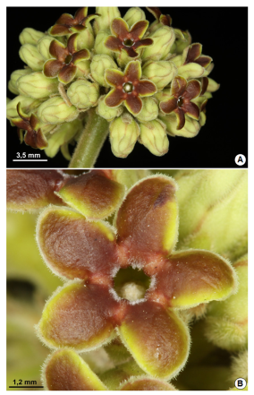 Ruehssia hilariana (E. Fourn.) F. Esp. Santo & Rapini, Kew Bull. 74-30: 30. 2019. ≡ Marsdenia hilariana E. Fourn. en Martius & Eichler, Fl. Bras. 6 (4): 322. 1885. TIPO: Brasil, Rio de Janeiro, A. St. Hilaire s.n. cat. A2. N° 123 (holotipo P 00645950!). Fig. 7 y 8.