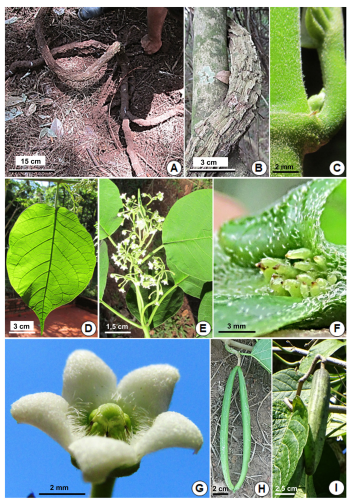Observaciones. A los tratamientos ya efectuados previamente se puede añadir que se trata de una liana selvática latescente, con tallos de hasta 20 m de altura y 4 cm de diám. En estado vegetativo, es similar a Macropharynx peltata (Vell.) J.F. Morales, M.E. Endress & Liede, de la que se diferencia por su corteza agrietada con domos suberosos blandos al tacto y por sus hojas grandes no peltadas. A la descripción de Fournier (1885) y de Meyer (1947) se añaden aquí datos sobre raíces, frutos y semillas.