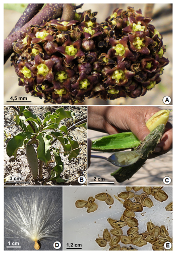 Observaciones. La especie adquiere hábito erecto con ramas flexuosas o se comporta como voluble. Los folículos, que constituyen un recurso alimenticio para etnias chaqueñas (Fig. 6B-C), son solitarios, fusiformes, con ápice aguzado, 12-17,2 × 1,5-2,3 cm. Placenta de 12,5-12,9 × 0,9-1,1 cm con numerosas alas membranáceas longitudinales. Semillas 140-150, de 8-11 × 4-7 mm. Penacho de 4-6 cm.