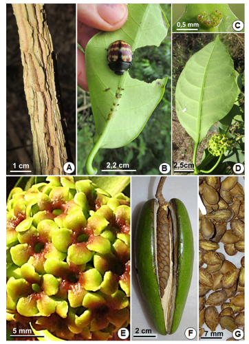 Observaciones. Presenta tallos de hasta 10 m de altura y 3 cm de diám., con corteza suberosa agrietada. Las raíces de los ejemplares estudiados son fibrosas, a diferencia de especímenes de Brasil que presentan raíces carnosas (Pessoa et al., 2011). En los ejemplares hallados en Misiones y Corrientes, las flores son verdes con garganta amarillenta luego de la antesis, posteriormente se tornan rojizas y liberan un intenso aroma a durazno. El folículo es verde-vivo, lustroso y glabro, de 14-15 × 4,2-4,8 cm, placenta de 11-12 × 1-1,1 cm con costillas laminares membranáceas, en un folículo se han contabilizado 332 semillas de 7-10 × 4-6 mm; penacho de 2-6 cm.