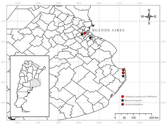 Las muestras frescas fueron coleccionadas en los partidos de la Costa, de Lomas de Zamora y de Moreno en la provincia de Buenos Aires, Argentina (Fig. 1), y fueron documentadas y preservadas según la metodología estándar empleada para Agaricales (Largent, 1986). Se realizaron fotografías en campo y anotaciones de sus características macroscópicas como forma, tamaño y color del píleo, laminillas y estípite. También se observaron reacciones sobre el basidioma fresco con KOH 5%. Los colores se anotaron de acuerdo con Kornerup & Wanscher (1987).