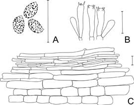 Se utilizó el programa Piximètre (versión 5.10; www.piximetre.fr) para realizar la medición de todas las estructuras microscópicas, y se utilizaron los siguientes símbolos: Q = coeficiente entre el largo y el ancho de las esporas; Qe = media de los valores de Q; N= número de esporas medidas; Me = tamaño promedio de las esporas.