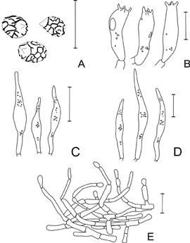 Basidios (Fig. 5B) 33,0-55,0 × 8,5-11,5 µm, claviformes a subclaviformes, 4-esporados. Pleurocistidios (Fig. 5C) 50-80 × 7-10 µm, cilíndricos a fusiformes, anchos en la porción baja, abundantes. Queilocistidios (Fig. 5D) 25,0-45,0 x 5,0- 7,7 µm, similares a pleurocistidios, frecuentemente con vértice submucronado, abundantes. Pileipellis (Fig. 5E) una trichodermis, no gelificada, con hifas emergentes de 10-40 x 2-5 µm; subpellis con hifas isodiamétricas, hasta 12 µm de diám. Estipitipellis hifas entrelazadas irregularmente de donde emergen elementos terminales similares a los de la pileipellis. Fíbulas presentes.
