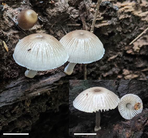 Píleo (Fig. 6) 15-30 mm de diám., al principio cónico-campanulado, luego plano-convexo con un umbón ligeramente deprimido en el centro, superficie blanquecina-grisácea (5B1) con tonalidades castaño grisáceas (6D6) hacia el centro y estrías radiales del mismo color, higrófano, subvícido a víscido. Los primeros estadios del píleo presentan tonalidades castaño oscuras (7E6). Carne delgada, menor a 2 mm. Laminillas adnexas a adnatas, subdistantes, ligeramente anchas, con lamélulas de dos tamaños, blancas (5A1). Estípite 10-20 x 1-3 mm, central, cilíndrico, blanquecino grisáceo (5B2), aclarándose hacia el ápice (5B1), disco basal de color ocre-grisáceo (6D4). Esporada blanca-blanquecina. Olor levemente cloroso o no distintivo, la intensidad es variable entre las distintas colecciones, generalmente muy leve. Sabor no distintivo. Comestibilidad desconocida, sin valor culinario, carne escasa. Bioluminiscencia no observada. Esporas (Fig. 7A) (5,5) 6,4-8,8 x 3,4-5,0 µm; Me = 7,5 x 4,2 µm; N = 52; Q = 1,6-2; Qe = 1,7; elipsoidales, lisas, hialinas, pared delgada, débilmente amiloides. Basidios (Fig. 7B) 14,5-19,0 x 7,5-9,5 µm, claviformes, 4-esporados, fíbulados.