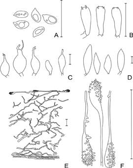 Pleurocistidios ausentes. Queilocistidios (Fig. 7C) 30-60 x 9-18 µm, fusoides-ventricosos a claviforme- rostrados, lisos, ápice delgado, cónico simple o bífido-ahorquillado, hialinos, inamiloides, de pared delgada. Trama himenoforal regular, formada por hifas cortas, no gelatinosas, dextrinoides y de pared delgada. Pileipellis (Fig. 7E) un ixocutis (180-250 µm de grosor), compuesto por hifas estrechas, hialinas, de pared delgada, inamiloides, 1,5-3,0 µm de diám., elementos terminales (Fig. 7F) 20-43 x 7-15 µm, claviformes a sub-cilíndricos, espinulados, hialinos, inamiloides, pared delgada. Hifas del contexto del píleo entrelazadas, cilíndricas, pared delgada, no gelatinosas, hialinas, dextrinoides, 3-16 µm de diám. Estipitipellis un cutis formado por hifas corticales, 3-8 µm de diám., no gelatinosas, paralelas, lisas, cilíndricas, hialinas, inamiloides, dextrinoides. Caulocistidios (Fig. 7D) 50-80 x 7-14 µm, fusoides a lanceolados o ventricosos, hialinos, pared delgada, inamiloides, no gelatinosos, solitarios o en racimos. Fíbulas presentes en todos los tejidos.