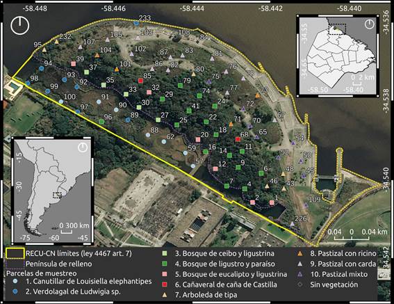 El área de estudio se encuentra al norte de la Ciudad Autónoma de Buenos Aires, dentro de la Comuna 13, a orillas del Río de la Plata, y abarca una superficie total de 23 ha (Fig. 1). Sus límites son el muro de contención de la Ciudad Universitaria, la desembocadura del arroyo White, el Río de la Plata y el Parque de la Memoria. En 1936 el predio ocupado actualmente por Ciudad Universitaria y la RECU-CN no existía, llegando el río hasta las vías del ferrocarril General Belgrano (Prezzi et al., 2011). Este terreno fue ocupado por rellenos sucesivos que ocuparon la plataforma de abrasión que afloraba en toda la costa de la ciudad, correspondiente al paleoacantilado que conformaban las barrancas de Belgrano y Nuñez (Prezzi et al., 2011). En particular, el área de estudio corresponde a un proceso parcial de polderización, realizado mediante la construcción de un terraplén unido a la costa sólo en un extremo, que delimitó una península y un humedal costero estuárico conectado al río por un canal de mareas ubicado al norte del área (Marcomini & López, 2004). El clima es subtropical húmedo con una temperatura media anual de 17,9 °C y una precipitación anual de 1082 mm (estación Aeroparque Jorge Newbery, Servicio Meteorológico Nacional, 2020). El área es afectada por el nivel del río, dominado mayormente por los vientos, dándose fenómenos climatológicos como las sudestadas. Este fenómeno se presenta como vientos provenientes del sector sudeste con persistencia regular e intensidades de moderadas a fuertes, que producen inundaciones en la costa del Río de la Plata con duraciones de uno a tres días (Kreimer et al., 2001).