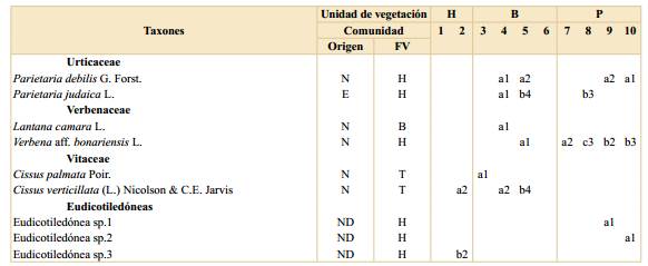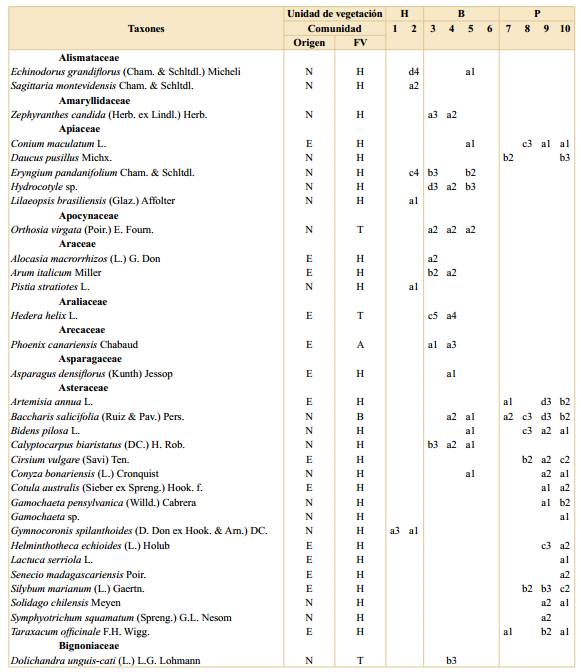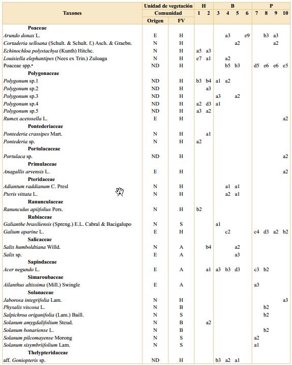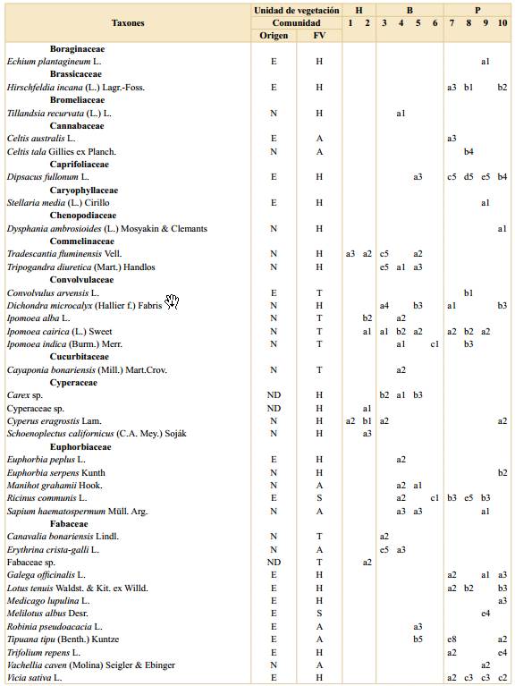 Tabla 1. Listado de especies registradas en la Reserva Ecológica Ciudad Universitaria - Costanera Norte. Se indica si la especie es nativa en la región, su forma de vida, frecuencia y cobertura en cada comunidad por unidad de vegetación. Abreviaturas: H, Humedal; B, Bosque; P, Pastizal con arboledas; comunidades: 1, Canutillar de Louisiella elephantipes; 2, Verdolagal de Ludwigia sp.; 3, Bosque de ceibo y ligustrina; 4, Bosque de ligustro y paraíso; 5, Bosque de eucalipto y ligustrina; 6, Cañaveral de caña de Castilla; 7, Arboleda de tipa; 8, Pastizal con ricino; 9, Pastizal con carda; 10, Pastizal mixto; E, exótica; N, nativa; ND, no determinada; FV, forma de vida; A, árbol; B, arbusto; H, hierba; S, subarbusto; T, trepadora; frecuencias: a, 1-20%; b, 21-40%; c, 41-60%; d, 61-80%; e, 81-100%; coberturas: 1, 0-0,1%; 2, 0,1-1%; 3, 1-5%; 4, 5-10%; 5, 10-25%; 6, 25-33%; 7, 33-50%; 8, 50-75% y 9, 75-100%.