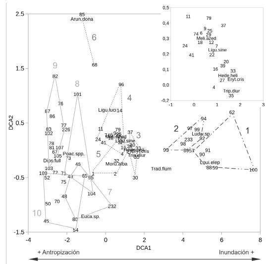 Los ejes DCA1 y DCA2 tuvieron autovalores de 0,9 y 0,4 y explicaron el 6% y el 3% de la variabilidad de los datos respectivamente (Fig. 2). En el extremo positivo del eje DCA1 se observó un conglomerado de parcelas que pertenecen a la porción anegada del área de estudio, ubicadas entre el murallón de contención de Ciudad Universitaria y la porción elevada del terreno que corresponde a la península de relleno y, también, sobre la porción inundable costera del área. En el sector central del ordenamiento se encontraron las parcelas ubicadas sobre la península, desde la orilla inundable hasta el centro de la misma, donde el terreno pasa a ser más elevado y disminuye la posibilidad de ingreso de agua ante eventos extraordinarios de sudestada. En el extremo negativo del eje DCA1 se agruparon las parcelas correspondientes a la porción de la península más cercana al río, cuyos rellenos son más elevados que en la porción antedicha, y se encuentran completamente aislados de la dinámica estuarial, siendo a su vez la porción más antropizada. De esta forma se identificó en forma indirecta un gradiente ambiental de inundación hacia la derecha de la figura y, en sentido opuesto al anterior, un gradiente de antropización que incluye tanto la existencia de un sustrato antrópico, como la de disturbios producidos por el humano (Fig. 2).