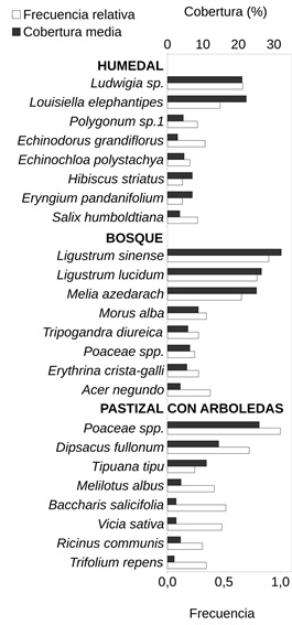 En cuanto a la unidad de vegetación de Bosque, a pesar de la alternancia de la especie dominante en el dosel, se destacó la abundancia de Ligustrum sinense en el estrato medio. Esta especie asiática constituye una invasora exitosa en la región, que se desarrolla en etapas tempranas a intermedias en la sucesión (Kalesnik et al., 2005; Kalesnik & Aceñolaza, 2008; Sirolli & Kalesnik, 2015). Entre las causas de dicho éxito se mencionan la dispersión por aves durante la colonización inicial del área, la gran producción de frutos y la formación de un importante banco de semillas y de plántulas (Montaldo, 1993; Kalesnik et al., 2013). A su vez, se observó una baja cobertura de especies nativas (18%) que, a diferencia de las comunidades del Humedal, propone una composición novedosa en comparación con sus contrapartes descritas en la bibliografía para ambientes naturales de la región pudiéndose considerar, en consecuencia, neoecosistemas.