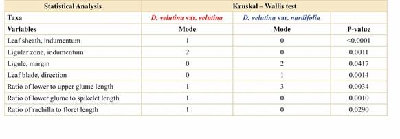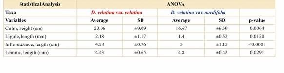 Based on groups I and II, a Discriminant Analysis was performed using uncorrelated quantitative characters. Differences between a priori groups resulted significant (p < 0.001) on the discriminant function; the lemma length and floret width contributed most to the negative end of the linear discriminant associated with D. velutina var. nardifolia, while the inflorescence length contributed most to the positive end associated with D. velutina var. velutina. A total of 90% of the individuals were correctly classified as D. velutina var. nardifolia, while 91% were correctly classified as D. velutina var. velutina.