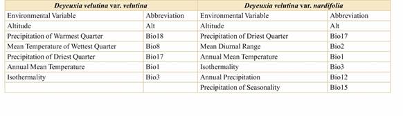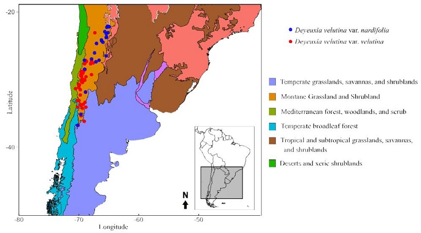 Deyeuxia velutina inhabits in areas with annual cumulative precipitation less than 400 mm and an average annual temperature ranging from 0° to 32°C. Both varieties partially overlap their potential distribution in areas with low habitat suitability. Notwithstanding, they are mainly segregated by the geographic latitude: D. velutina var. nardifolia occurs in the northern distribution area, while D. velutina var. velutina inhabits within the southern limit of the species’ range. The differences in the distribution of both varieties can indicate a divergence mechanism linked to new environmental conditions.